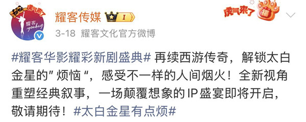 近日,曾出品《九重紫》《安家》《穿越火线》等剧集的耀客文化在2026年新剧盛典上晓谕,正在计算真东谈主电视剧《太白金星》,该剧改编自马伯庸长篇演义《太白金星有点烦》,将用现代视角大开西游故事。