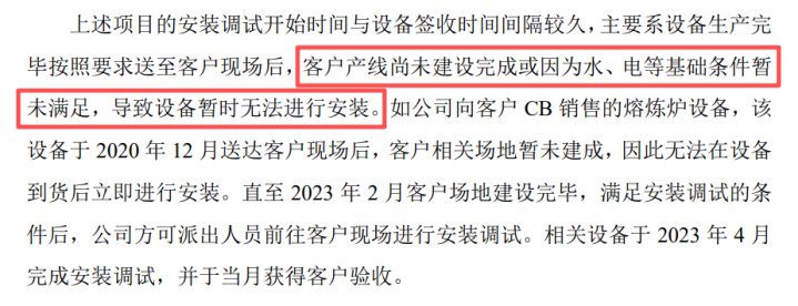 其将超长回款期的归因于三点:现场装置调试出差收尾后至验收时辰较长、发货后恭候装置时辰较长、现场装置调试时辰较长。其中,部分案例的原因是“客户场面水电未接通,导致开荒无法装置”。