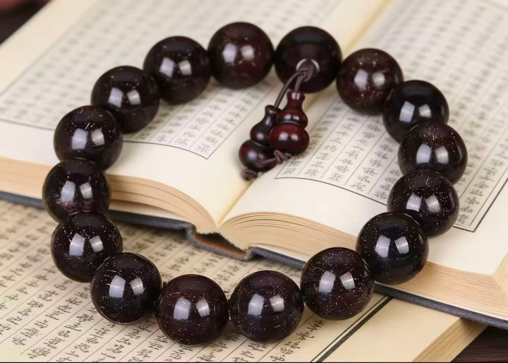 把古今元故人融得相配好,它的手串用的是高密度紫檀,金星和牛毛纹交汇在沿路,看起来相配古朴镇静。